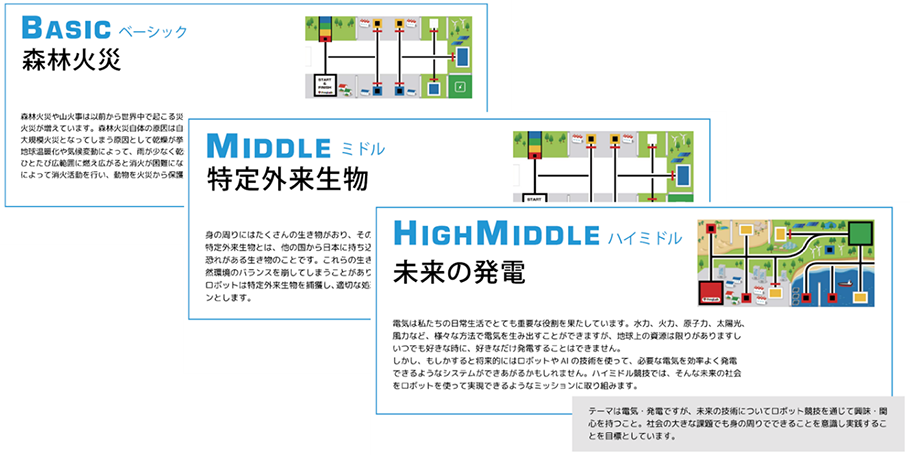 大会競技は習熟度に応じて「ベーシック競技(テーマ:森林火災・山火事)」「ミドル競技(テーマ:特定外来生物)」「ハイミドル競技(テーマ:未来の発電)」の3部門に分かれています。