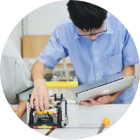 個別もしくはチームで探求テーマを設定し、それぞれに取り組みを行います。ロボットだけではなくAIを使用する教材、電子工作デバイスなど、学習レベルに応じた教材も使用できます。