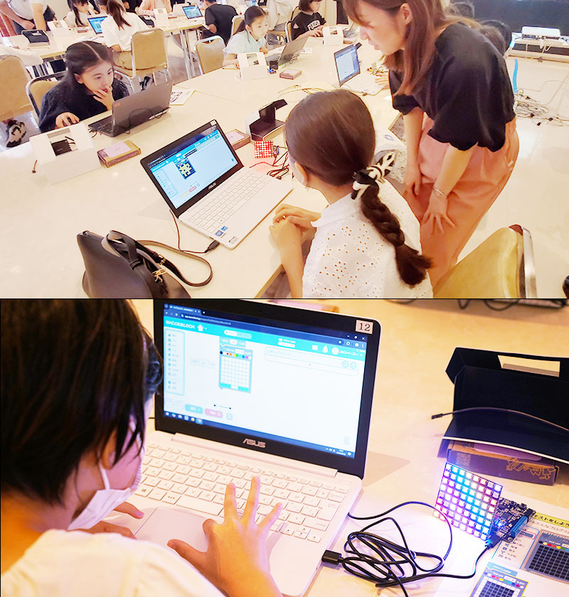 プログラミング教室では、AVAD社が提供するSPACEBLOCK®(スペースブロック)を使ってLEDを光らせ、舞台照明でも使われている技術を体験。プログラミングが初めてのお子様でも気軽にお楽しみいただけました。