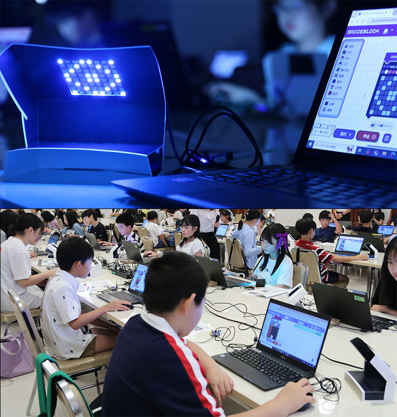 プログラミング体験教室では、子どもたちは劇場の舞台照明をイメージしながら、AVAD社が提供する SPACEBLOCK®(スペースブロック)を使って、自分だけの光の演出をプログラミングによってデザインしていました。様々な色や図形・文字を組み合わせるなどの工夫を凝らしながら舞台の迫力を再現しようと真剣に取り組む姿が印象的でした。