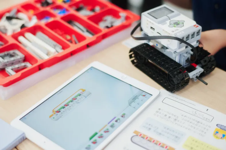 組み立てたロボットは、プログラムでモーターやセンサーを制御し、自由に動かします。